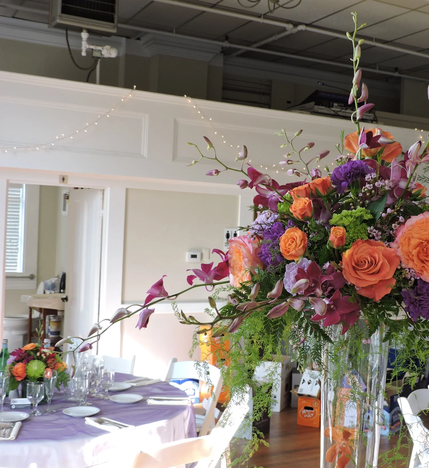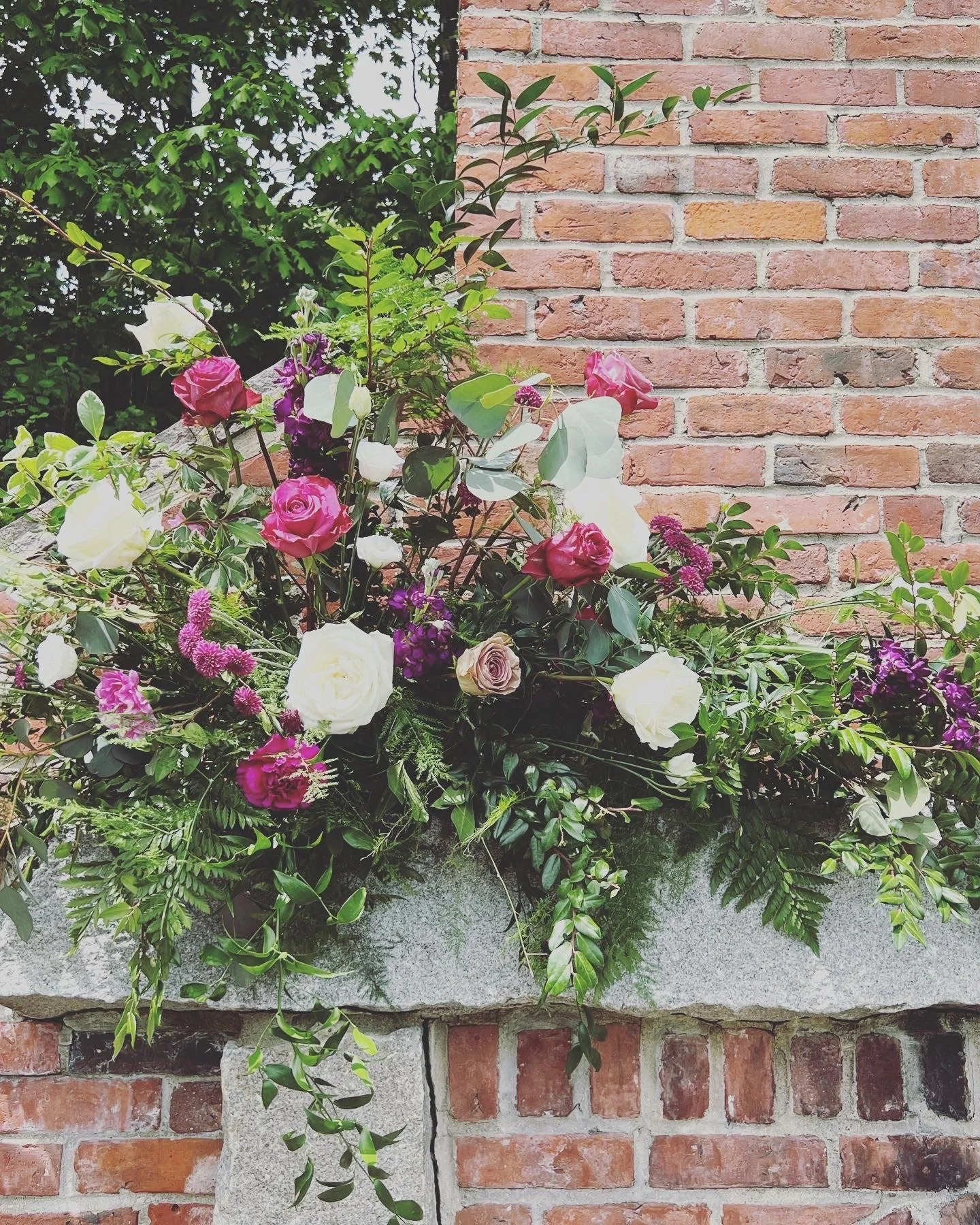Lush flowers for entry table at Castle Hill at the Crane Estate, Ipswich, MA created by Maureen Christmas AIFD CFD EMC of Floral Notes, Acton, MA